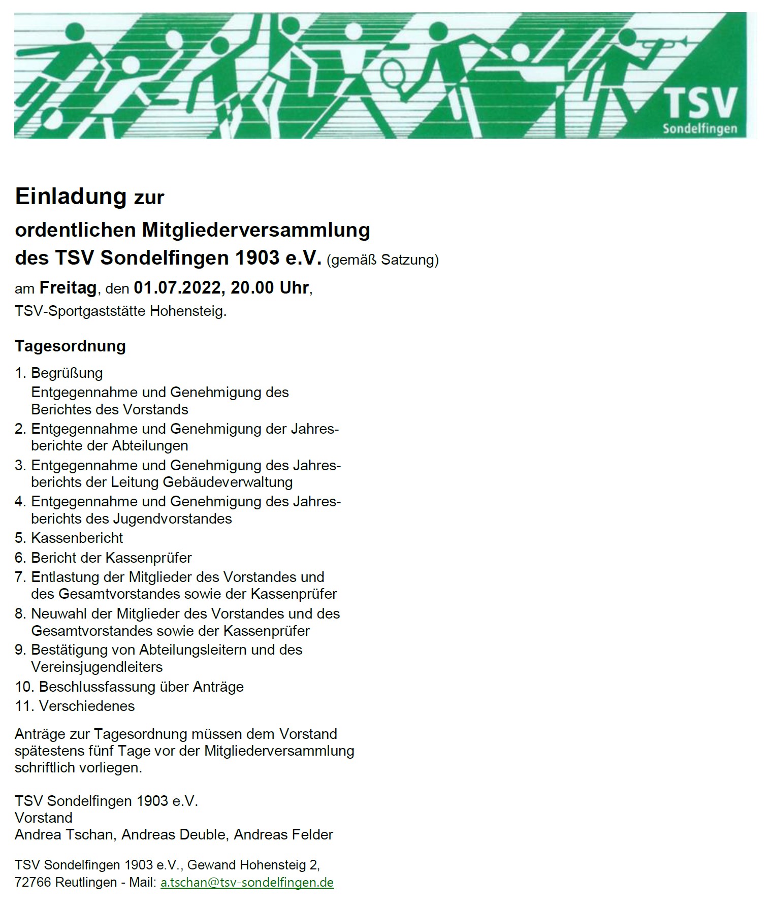 Einladung zur ordentlichen Mitgliederversammlung am 1. Juli 2022 um 20 Uhr
